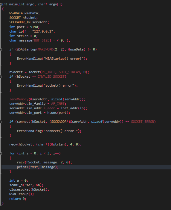 - write 함수가 호출되는 순간 데이터는 출력버퍼로 이동을 하고, read함수가 호출되는 순간 입력버퍼에 저장된 데이터를 읽어 들이게 된다. 즉, 입출력 버퍼는 소켓을 생성시 자동으로 생성되고 데이터는 각각의 입출력버퍼에 들어가며 write, read 함수를 통해 데이터 송수신이 아닌 버퍼에 있는 데이터를 읽는 것 뿐이다.