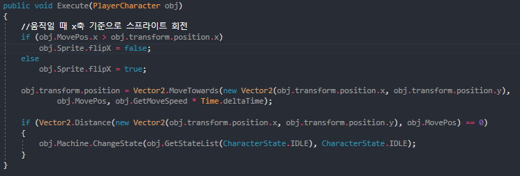 처음 상태로 들어가는 Enter()함수에 들어갈 때 스프라이트 X축을 정하도록 구현하였다.